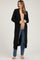 A solid hued long maternity cardigan featuring long sleeves, side pockets and an open front.