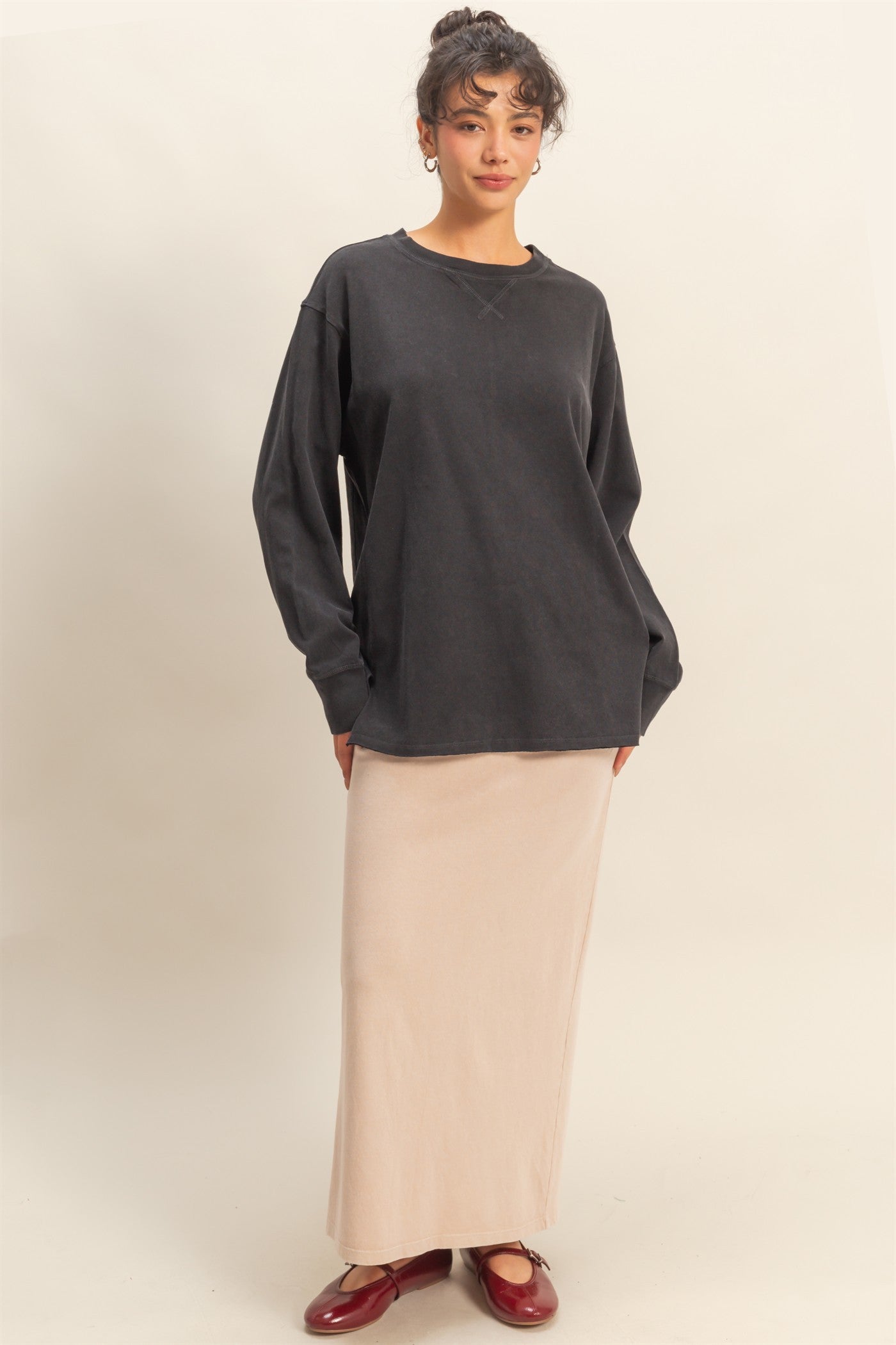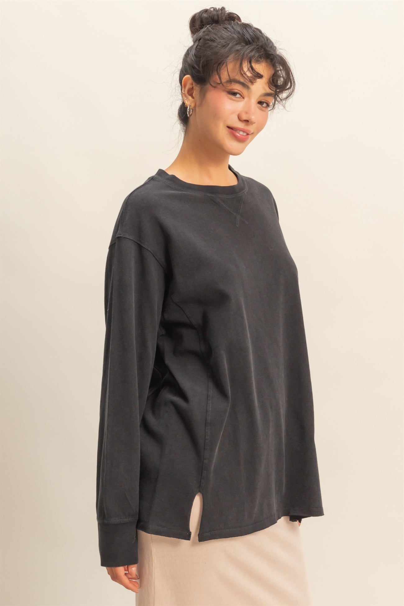 Black Mineral Washed Drop Shoulder Long Sleeve Top