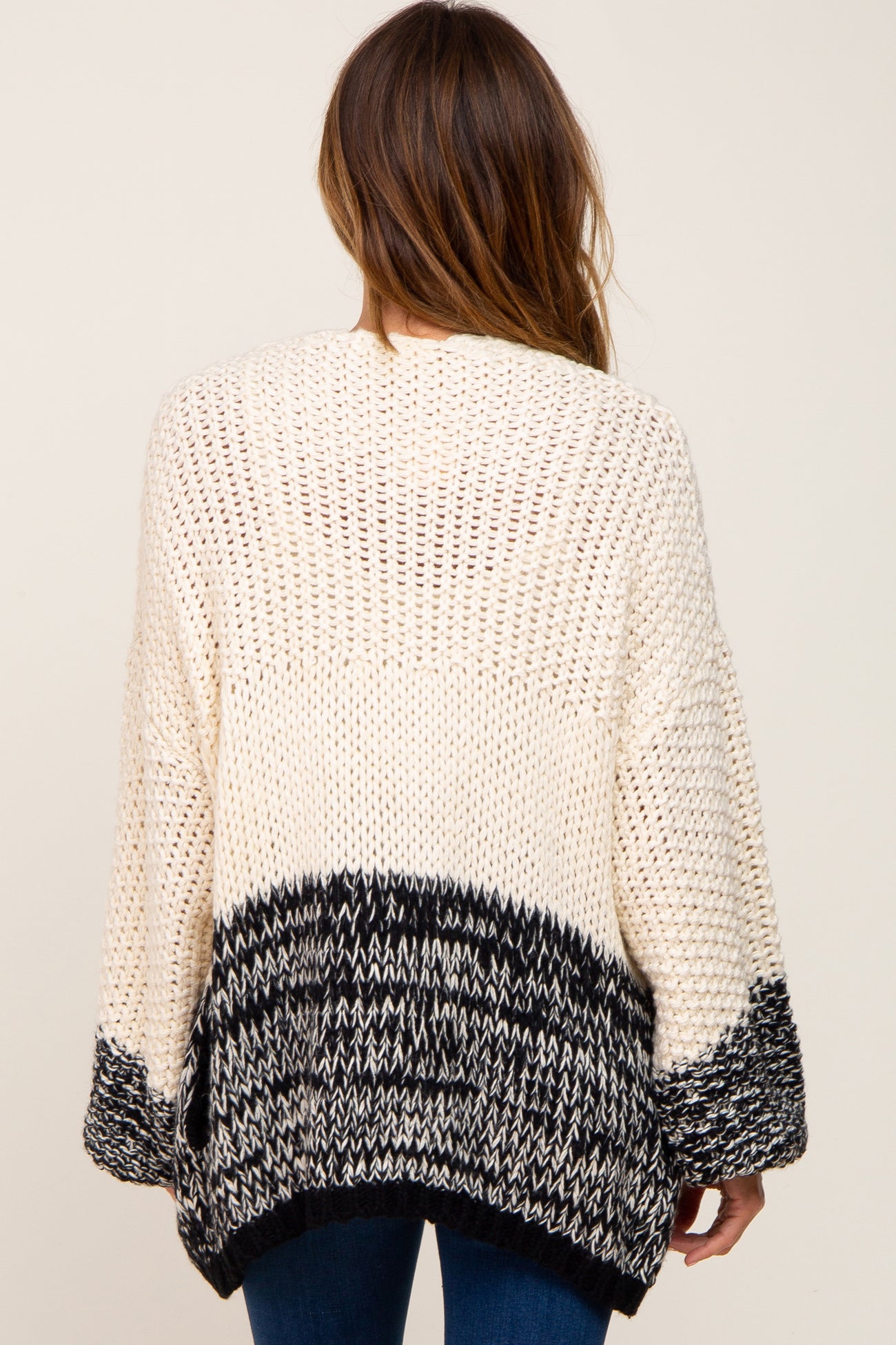 An open knit cardigan. Features drop shoulder long sleeves, an open front, and color blocking on the bottom half.
