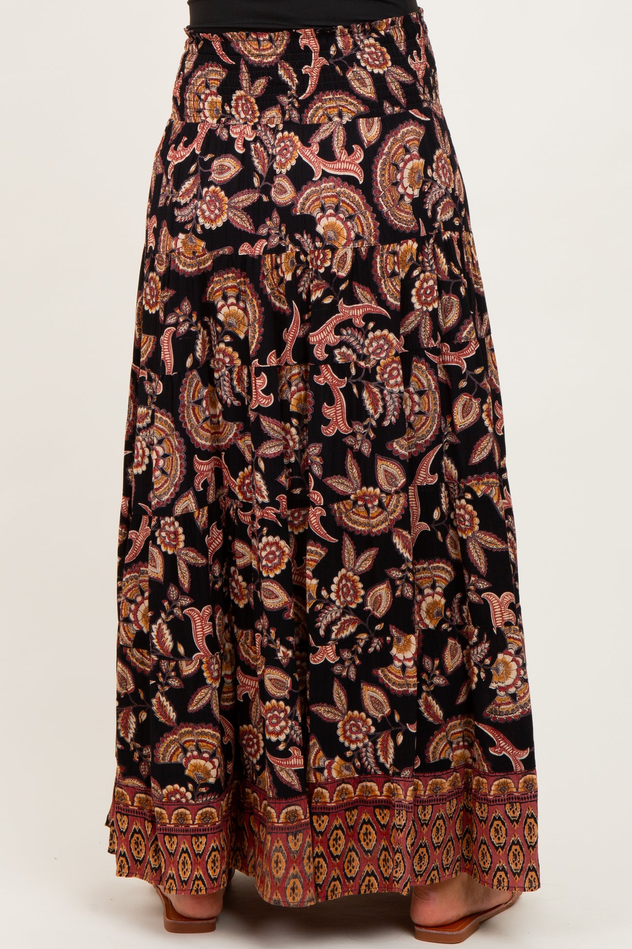 Black Paisley Smocked Waist Tiered Maternity Maxi Skirt