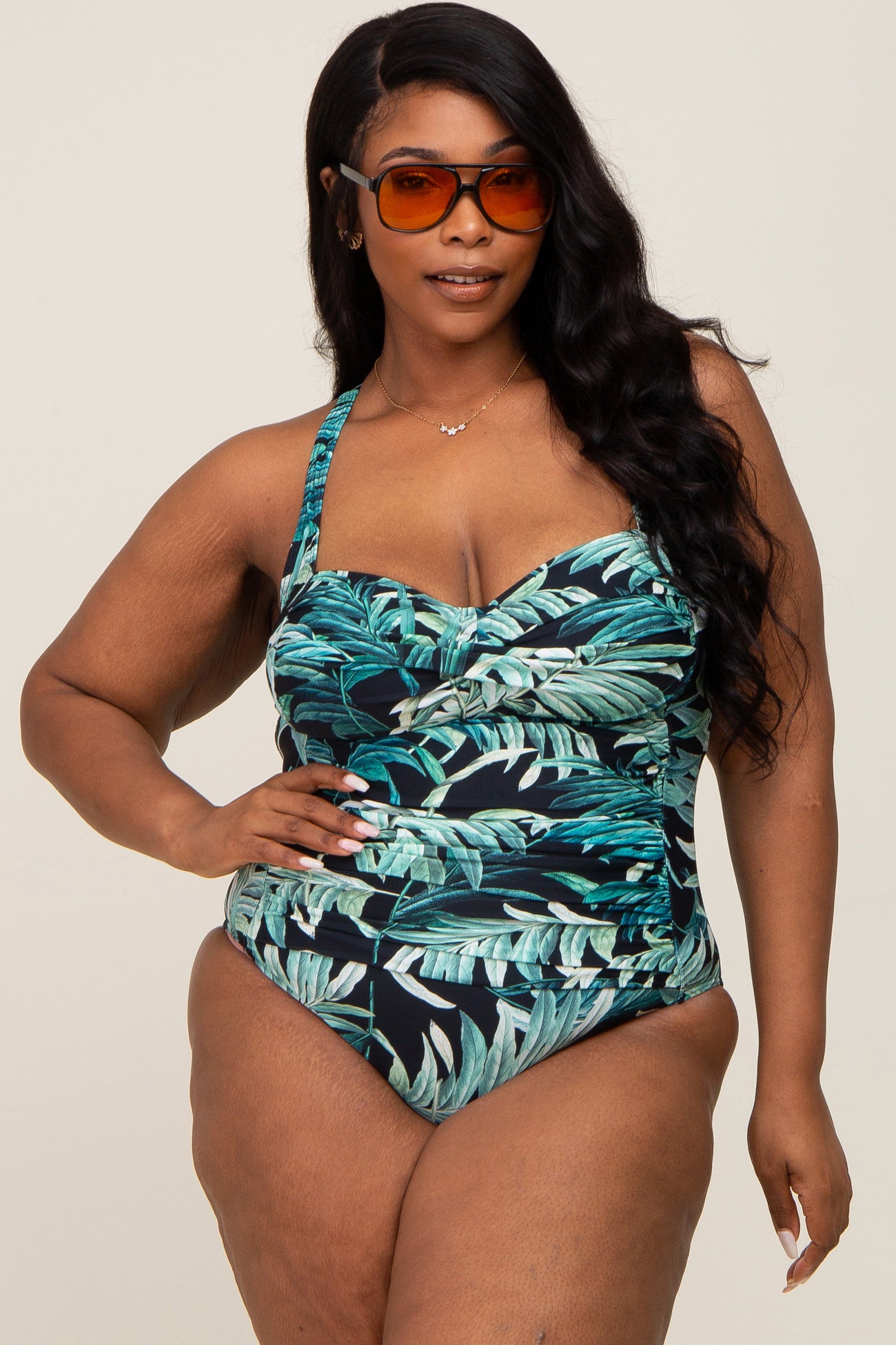 A palm print plus maternity one piece swimsuit featuring a ruched body, a padded bust and adjustable straps.