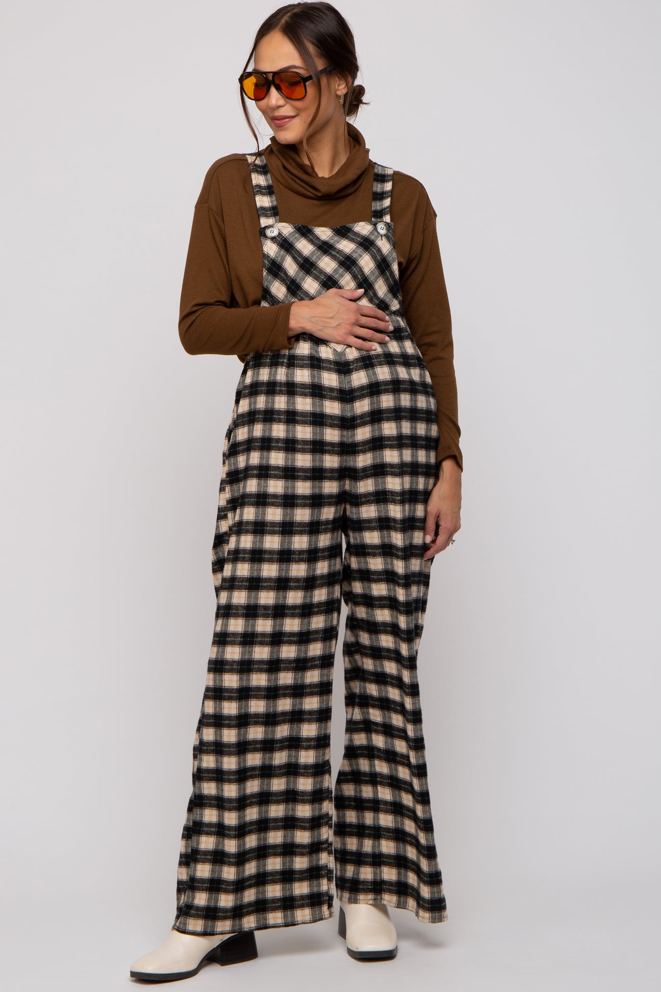 Black Plaid Button Front Wide Leg Maternity Overalls