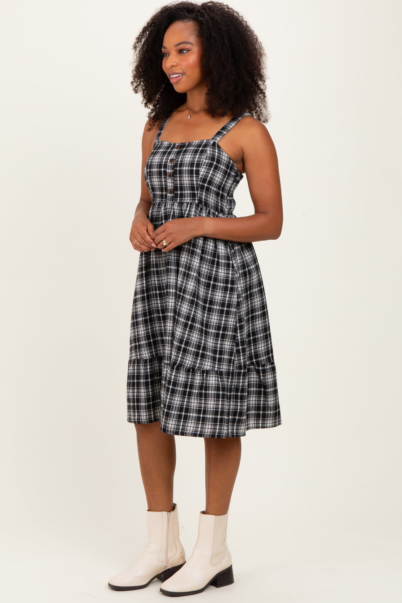 Step into effortless style with our Black Plaid Square Neck Dress. Featuring a flattering square neckline and adjustable straps, this dress combines classic plaid pattern with a modern silhouette. The button-front detail adds a touch of charm, while the gathered waist and tiered skirt offer a comfortable, flowy fit. Crafted from soft, breathable fabric, it’s perfect for any casual outing or laid-back event. Convenient side pockets add practicality without compromising style. Pair it with boots or sneakers for an easy, chic look all season long. Your new go-to dress awaits!