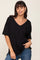 A solid top featuring a front pocket, short sleeves, a v-neckline and side slits.