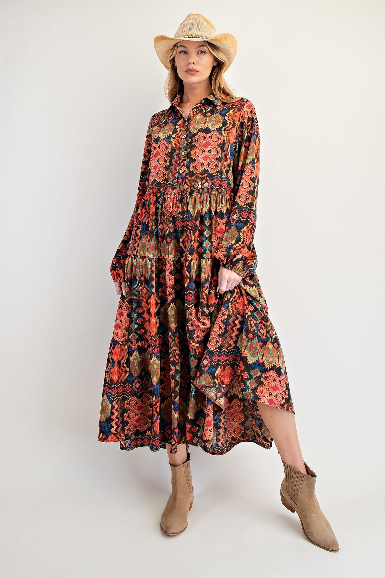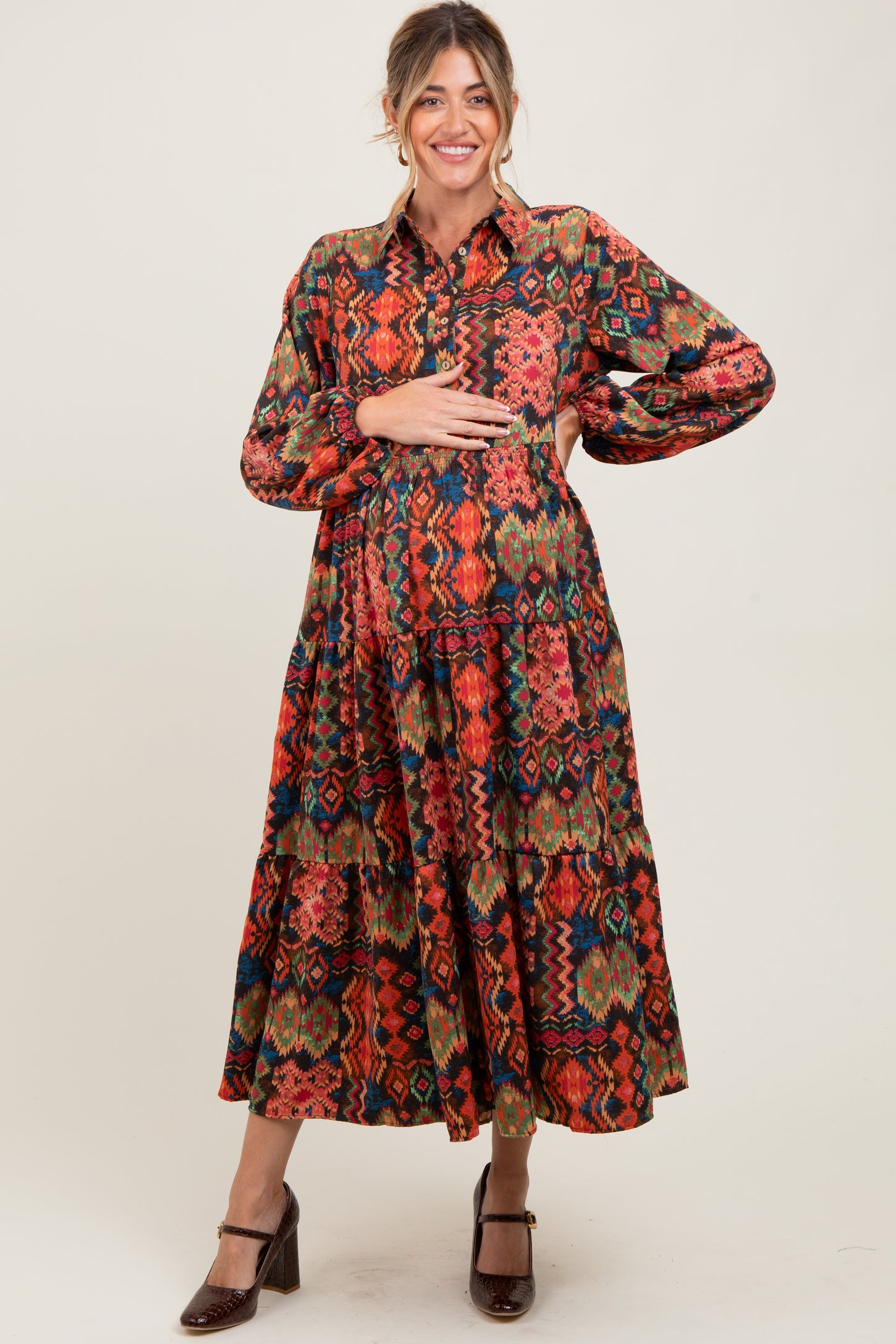 Black Printed Button Detail Tiered Maternity Midi Dress