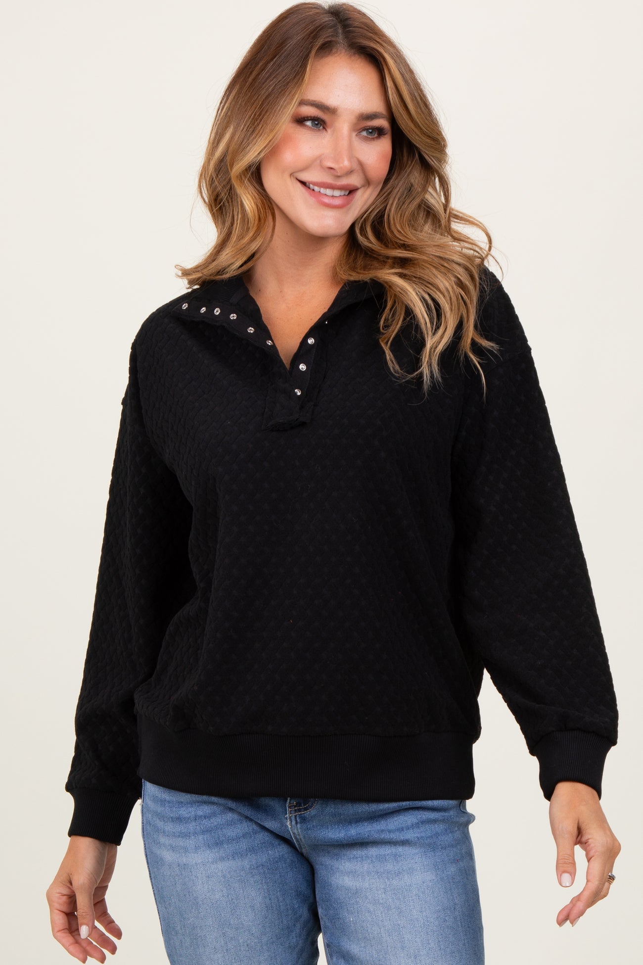 Black Quilted Knit Snap Collar Maternity Pullover Top