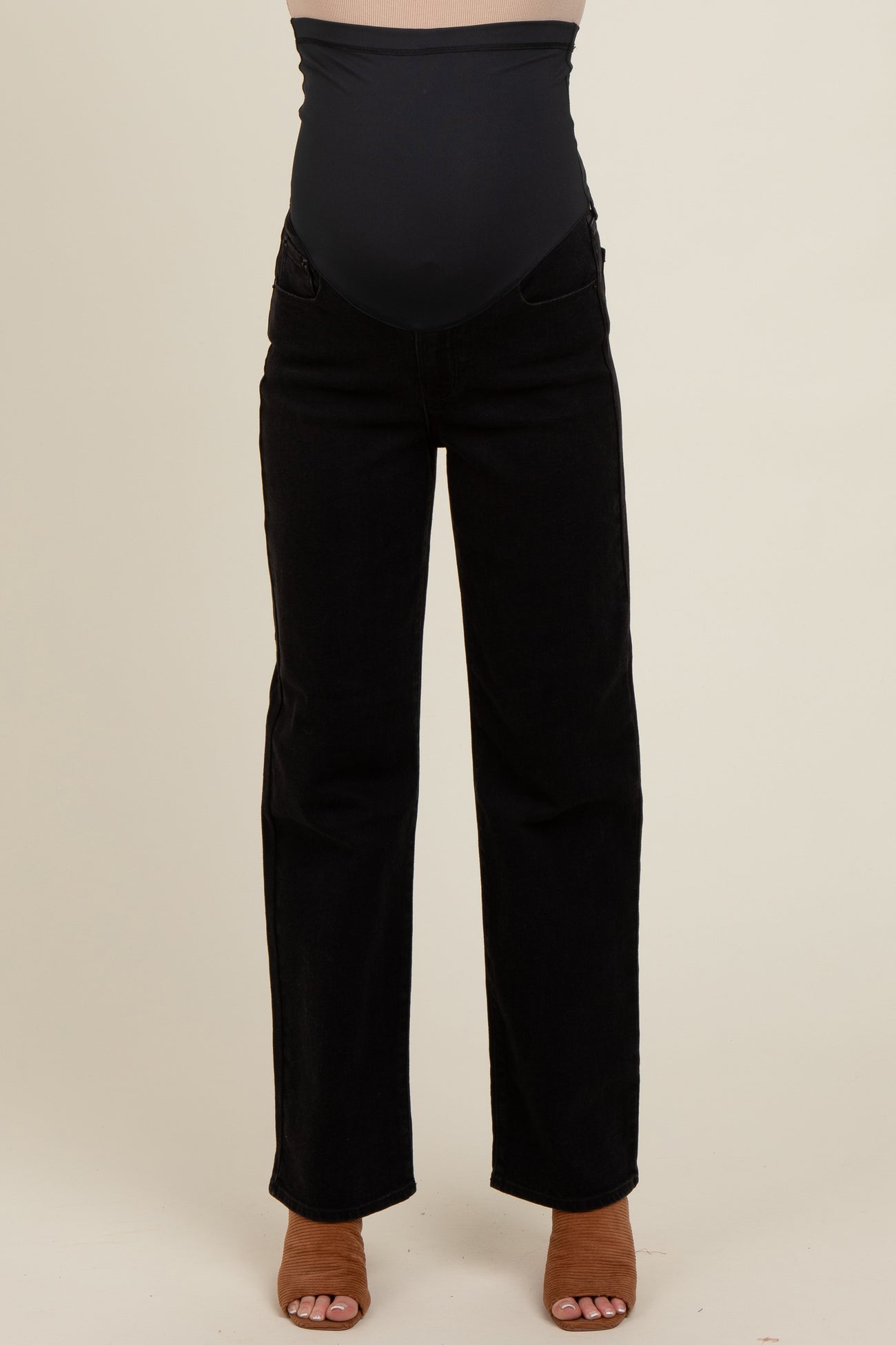 A dark wash pair of maternity jeans with five pockets and full panel elastic bellyband. Material as little stretch.