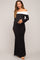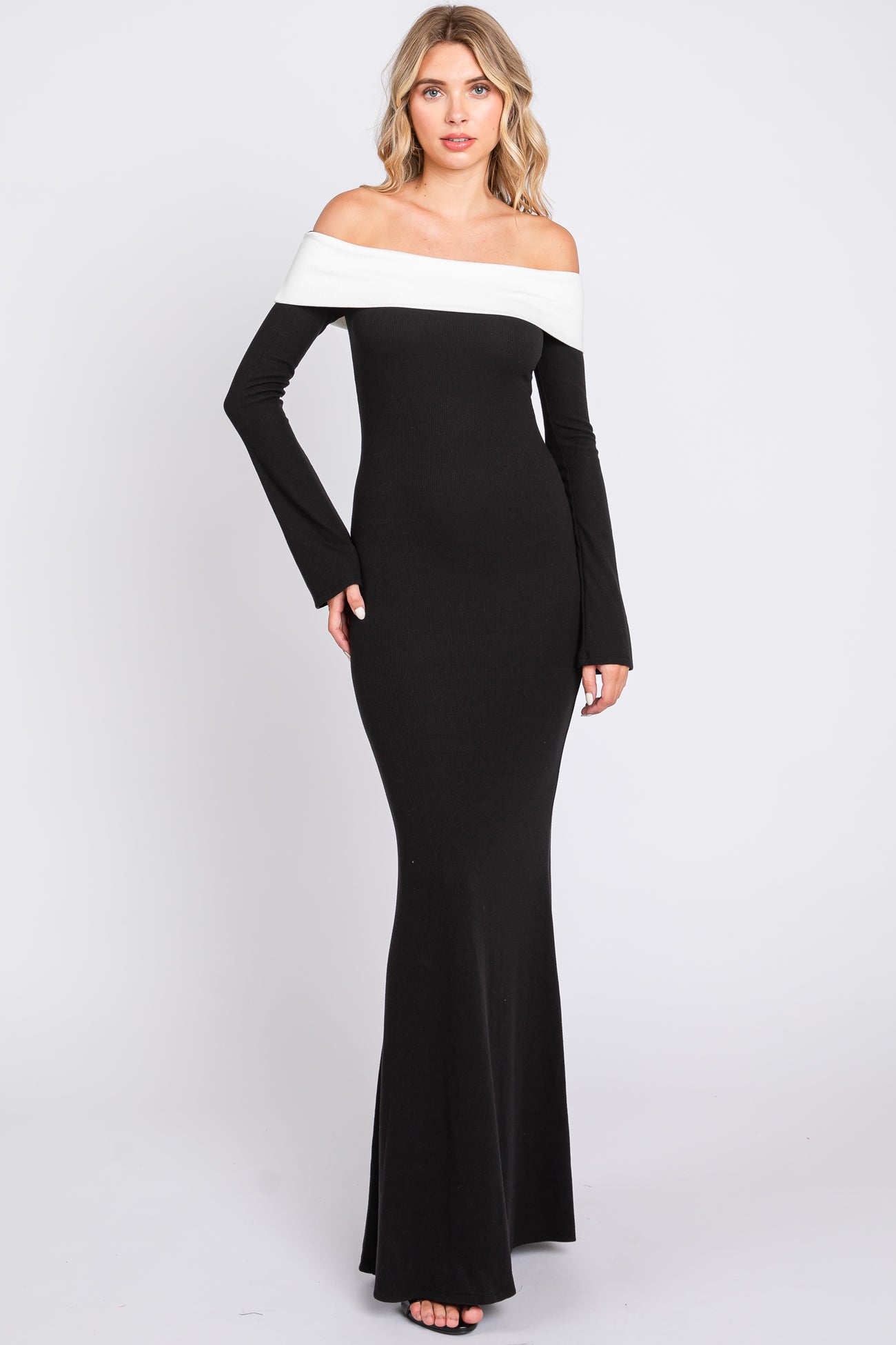 Black Ribbed Knit Colorblock Long Sleeve Off Shoulder Maternity Gown