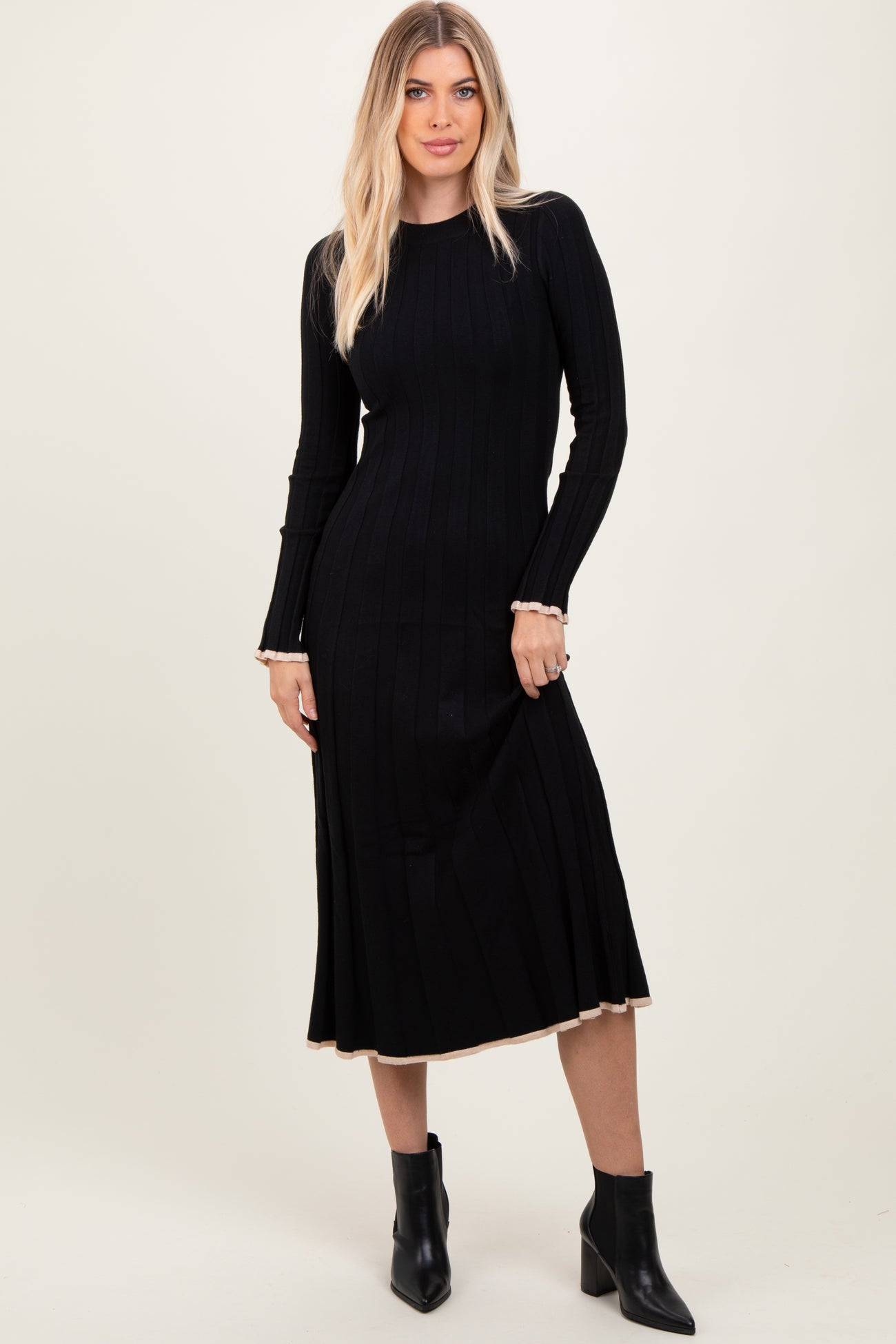 Elevate your wardrobe with this Black Ribbed Knit Maxi Sweater Dress, the perfect blend of comfort and style. Crafted from a soft, stretchy ribbed knit fabric, this dress features a flattering fitted silhouette that hugs your curves while allowing easy movement. The long sleeves and midi length keep you cozy on cooler days, while the subtle contrast trim at the cuffs and hem adds a chic finishing touch. Pair it with ankle boots for a polished daytime look or dress it up with heels and statement accessories for evenings out. A versatile and timeless piece, ideal for fall and winter wardrobes.
