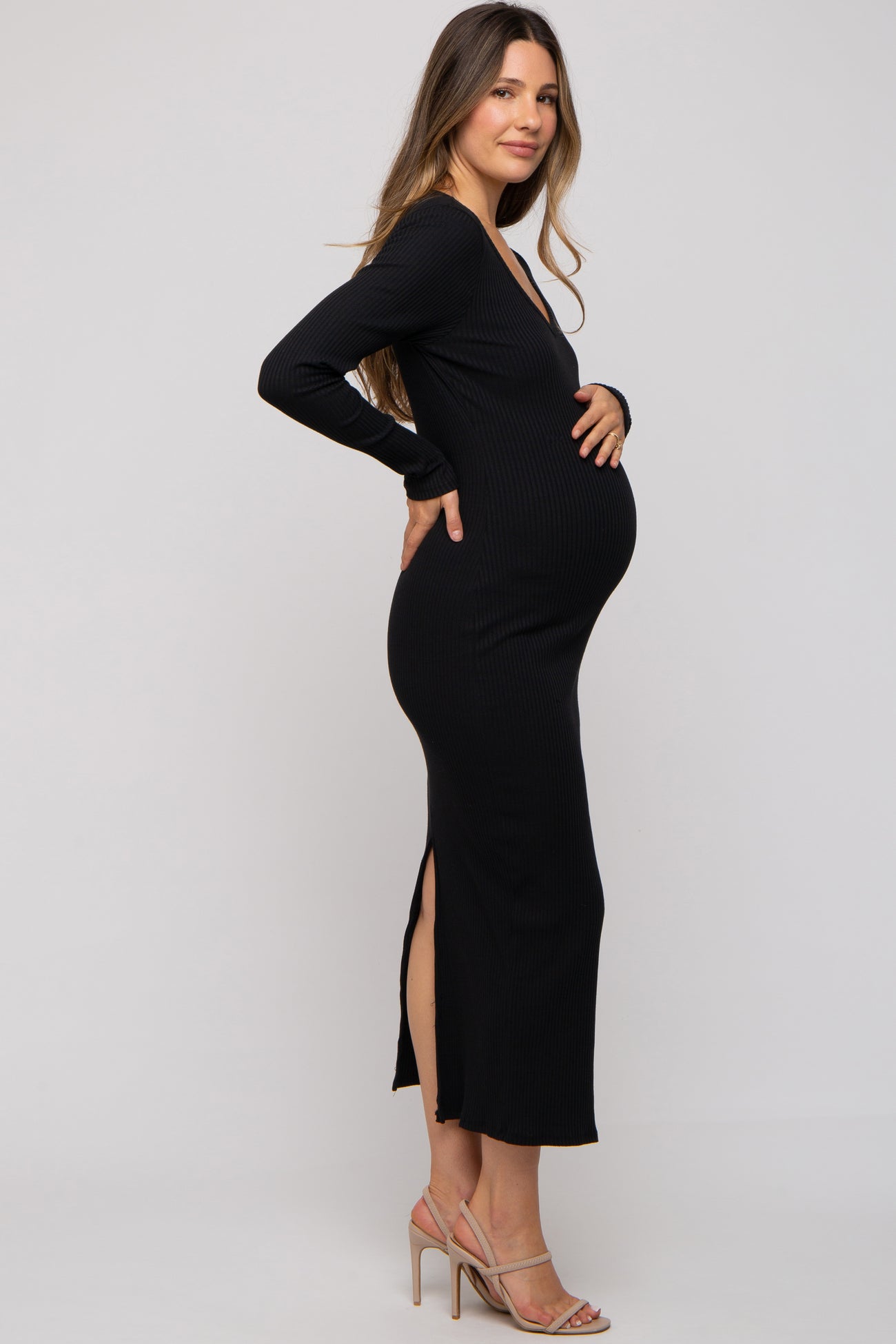 A solid ribbed maternity maxi dress featuring a back slit, long sleeves and a v-neckline.