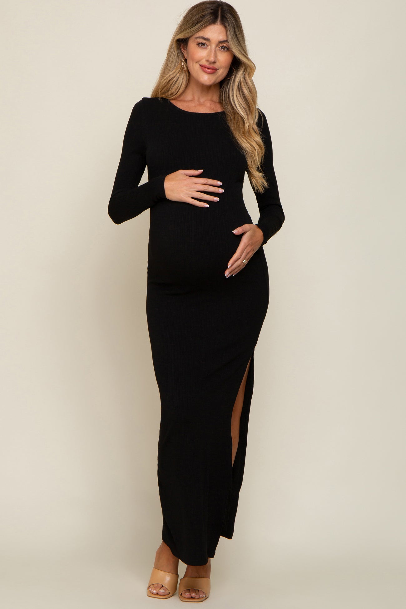 Black Ribbed Long Sleeve Side Slit Maternity Maxi Dress