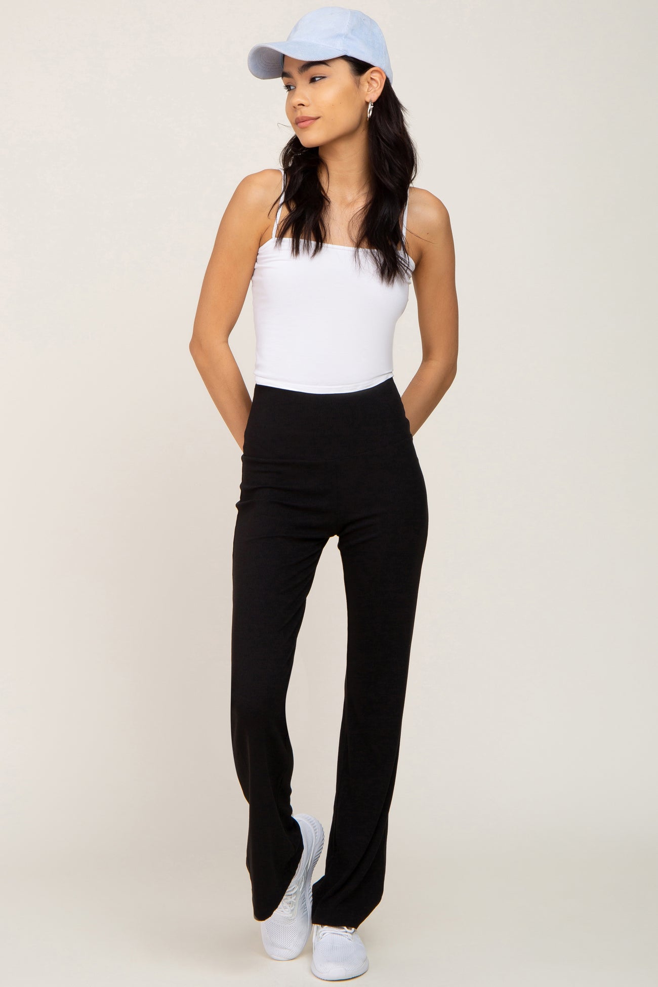 A pair of basic maternity pants in a ribbed material with a slight flare leg.