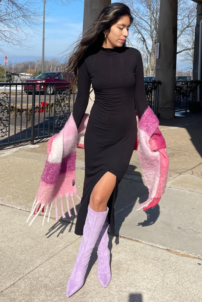 A solid ribbed maxi dress featuring a mock neckline, long sleeves and a side slit.