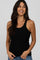 A basic ribbed tank top featuring a racerback and a rounded neckline.