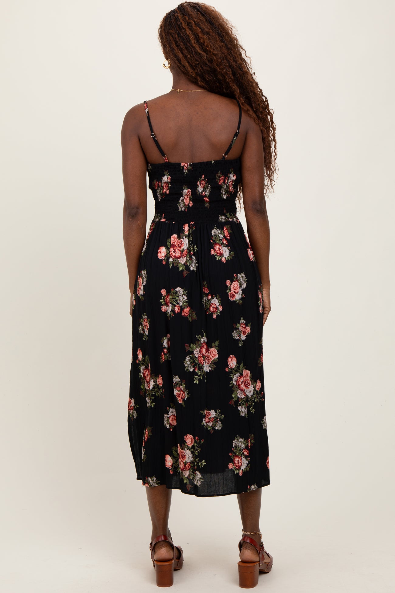 Black Rose Print Twist Front Cutout Midi Dress