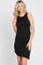 A sleeveless dress with a rounded neckline, a ruched side, and an asymmetrical hem. Dress is lined.