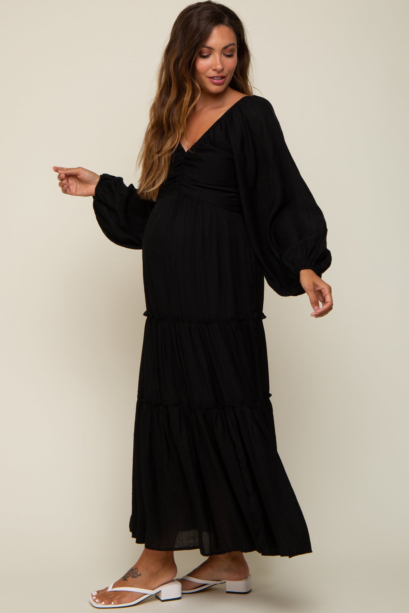 Black Ruched Front Cutout Back Tiered Maternity Maxi Dress