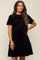 A solid velvet maternity dress with ruffle neckline, ruffle trim and button keyhole closure at back. Pocketed.