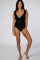 A solid hued one-piece swimsuit, featuring a deep v-neckline, adjustable straps with ruffle detailing, ruched sides, removeable padded cups and a double lining.