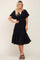 A midi dress with a v-neckline, short flounce sleeves, smocked back waistband, and ruffle accent tiered skirt. Front of the top and skirt are lined.