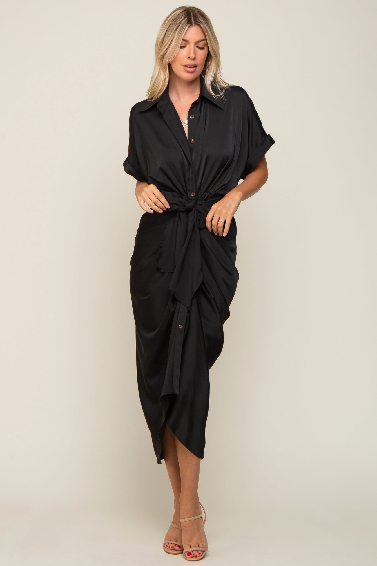 Black Satin Button Down Gathered Midi Dress