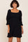 A solid short dress with a smocked bodice and 3/4 bubble sleeves. Skirt is lined.