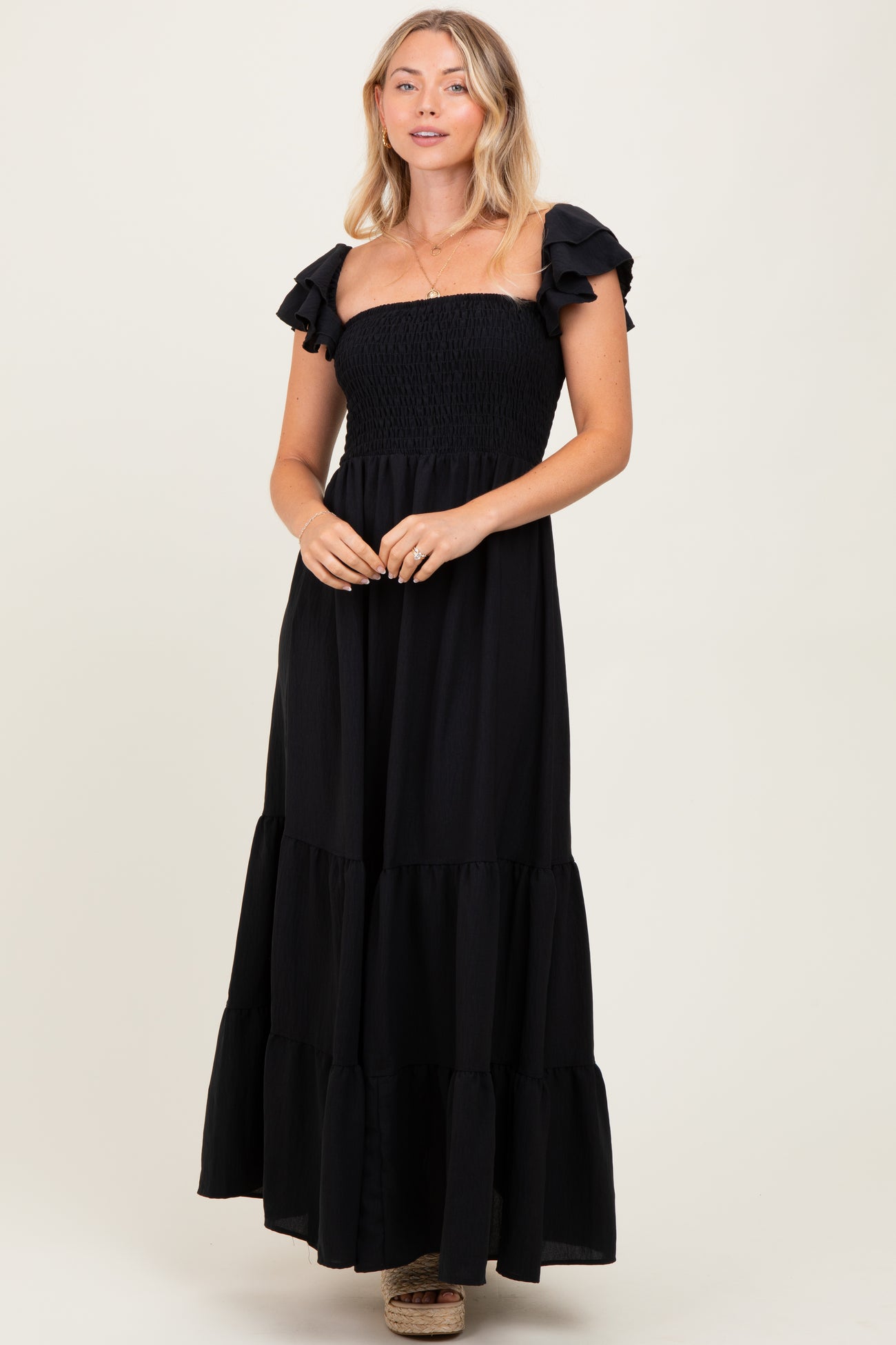 Black Smocked Ruffle Off Shoulder Tiered Maternity Maxi Dress