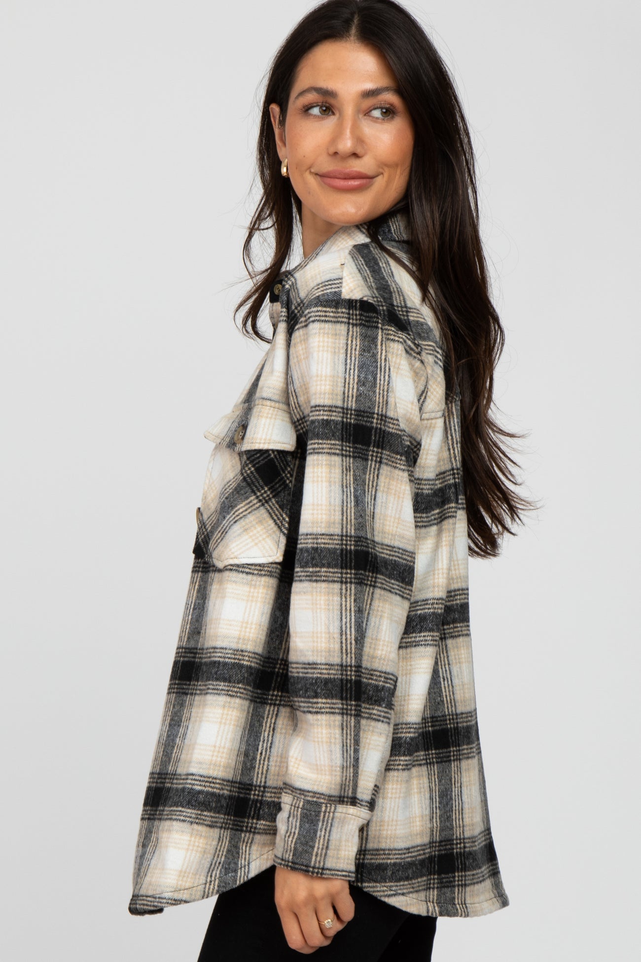 Details A soft knit plaid print flannel shacket featuring a collared neckline, a button down front, front pockets with button closures and long sleeves with a double button closure. Content + Care