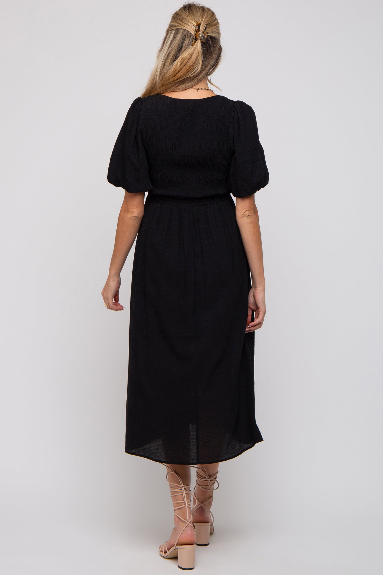 A solid hued maternity midi dress featuring a smocked top, short puff sleeves and a square neckline.