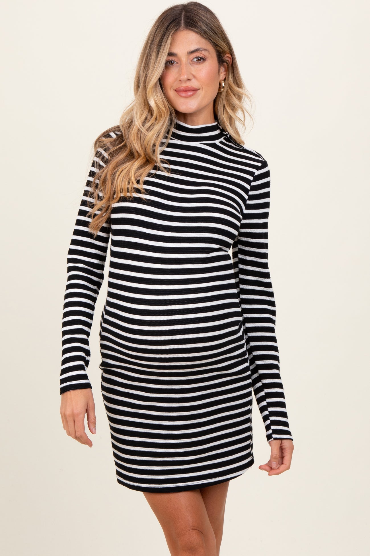 Stay chic and comfortable throughout your pregnancy with our Black Striped Mock Neck Long Sleeve Maternity Fitted Dress. Designed with soft, stretchy fabric, this dress gently hugs your curves while providing plenty of room for your growing bump. The classic black and white stripes paired with a stylish mock neck create a timeless look perfect for any season. Long sleeves add warmth and coverage, making it ideal for casual outings or dressier events. Pair with your favorite boots or flats for an effortlessly stylish maternity outfit. Available in multiple sizes to accommodate every stage of pregnancy.