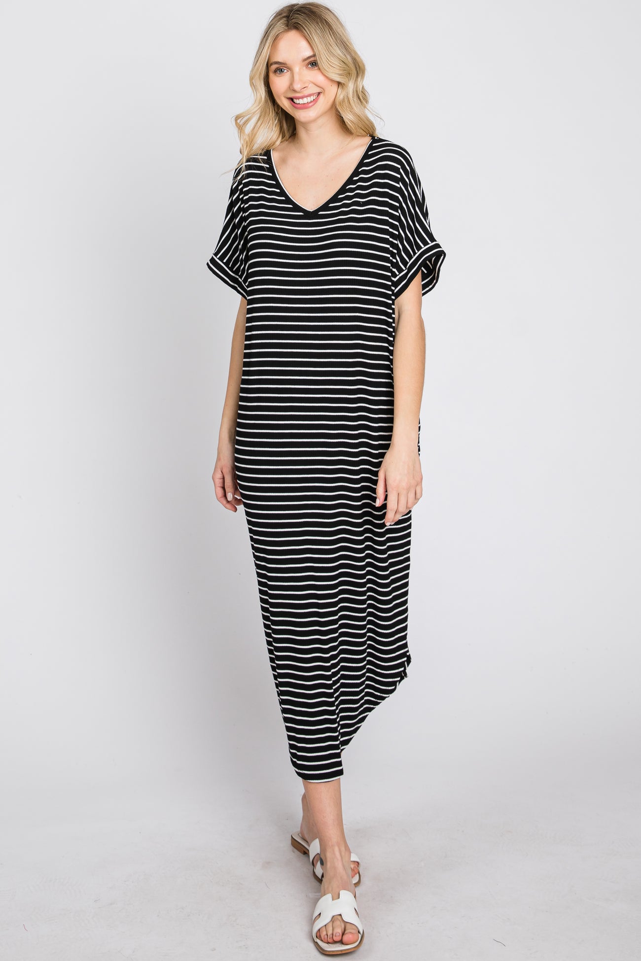 A striped ribbed midi dress featuring short cuffed sleeves, a curved hem and a rounded v-neckline.