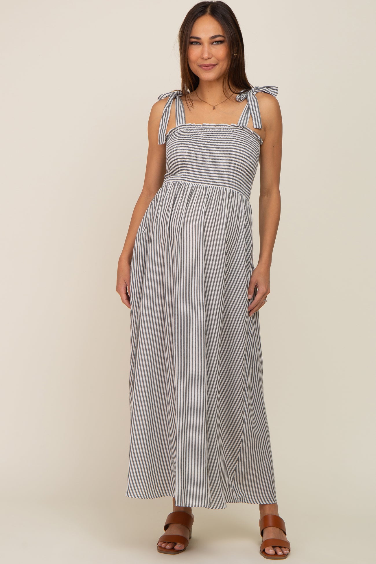 Black Striped Smocked Shoulder Tie Maternity Maxi Dress
