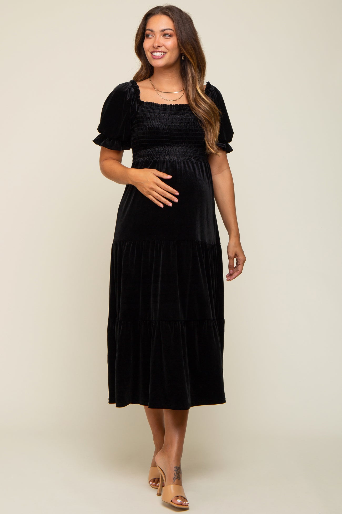 Details A solid short sleeve maternity midi dress in a velvet material with puff sleeves, a smocked bust and tiered skirt. Content + Care