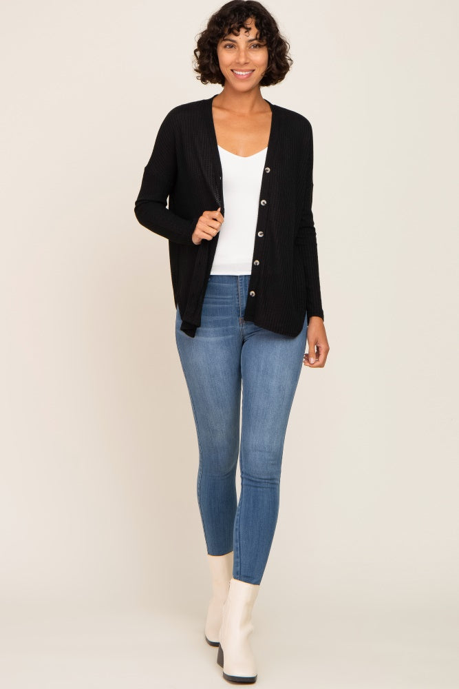 Black Waffle Knit Button Down Top