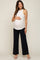 A pair of wide leg maternity jeans with 5 packets, a full panel belly band, and a raw hem. Material has high stretch.