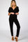 A solid hued maternity jumpsuit featuring short dolman sleeves, a v-neckline with wrap accent, a cuffed, tapered leg style, and a sash tie.