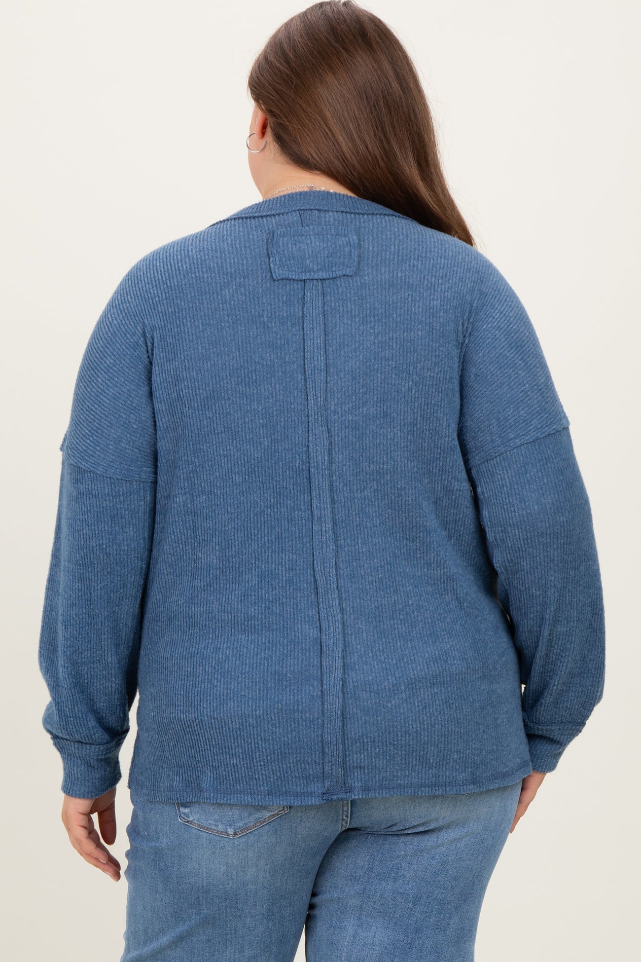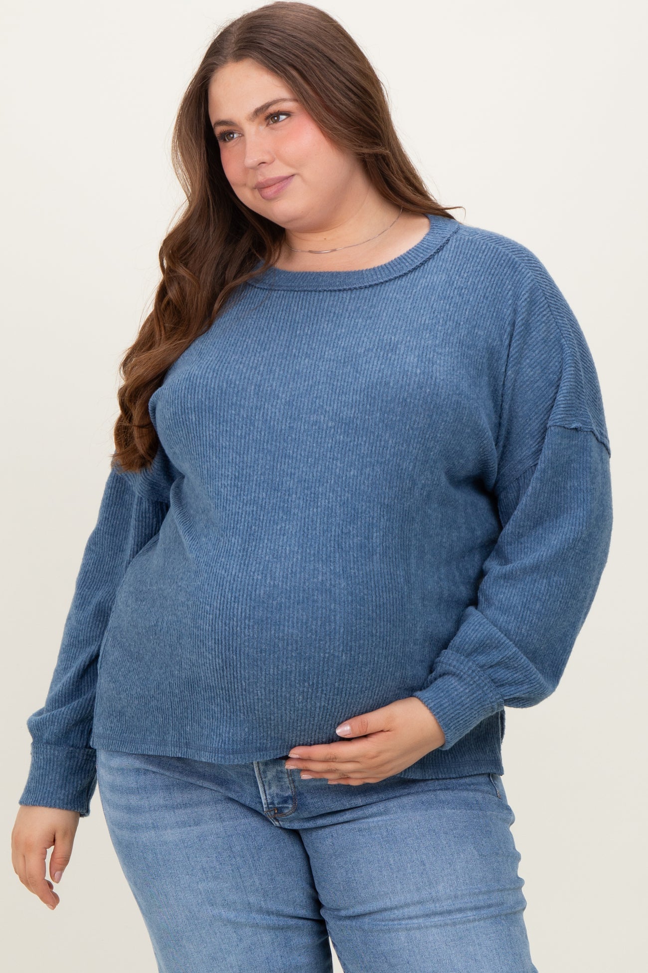 Blue Brushed Ribbed Knit Maternity Plus Pullover