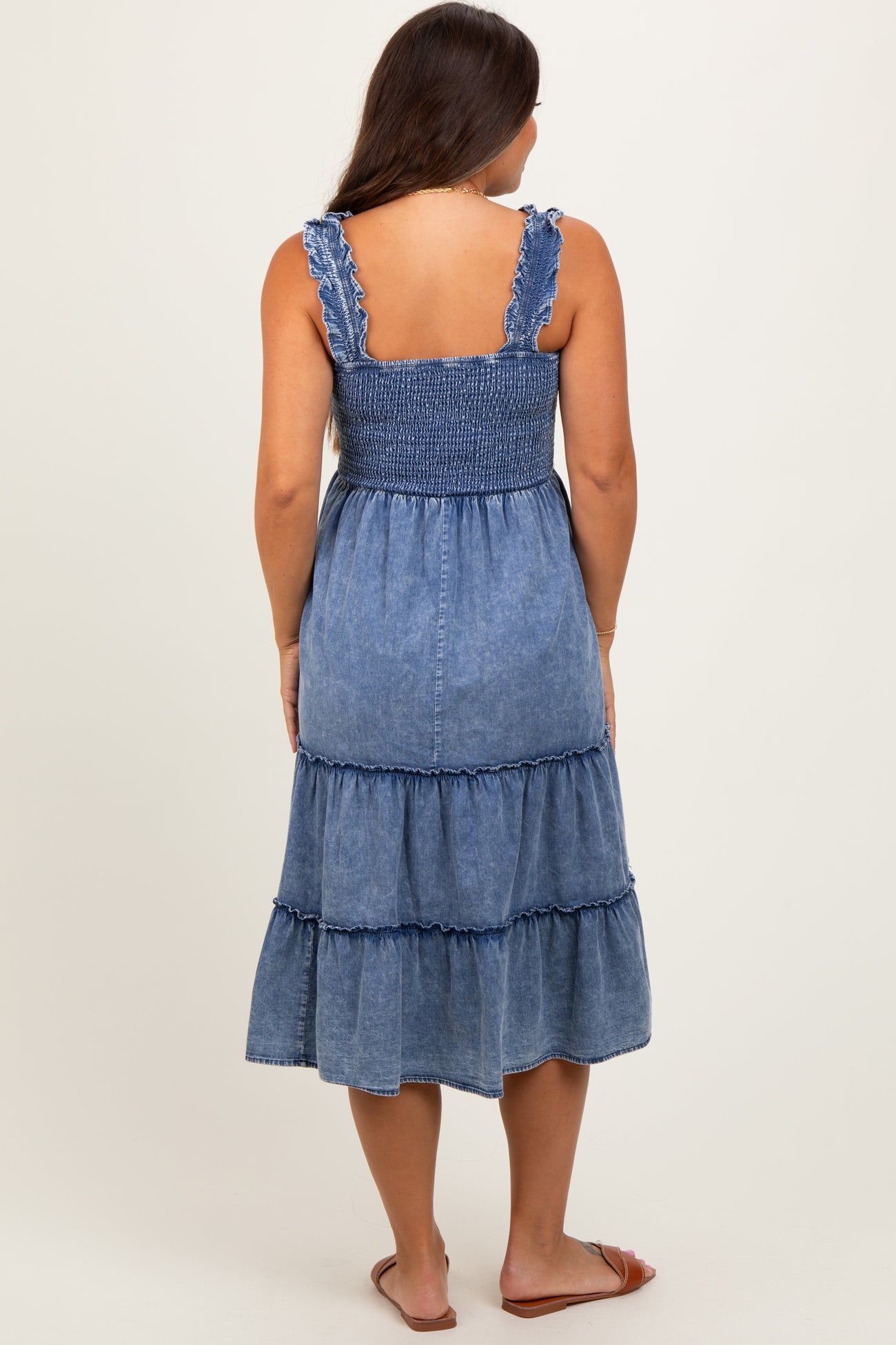 Blue Chambray Smocked Ruffle Tiered Maternity Midi Dress