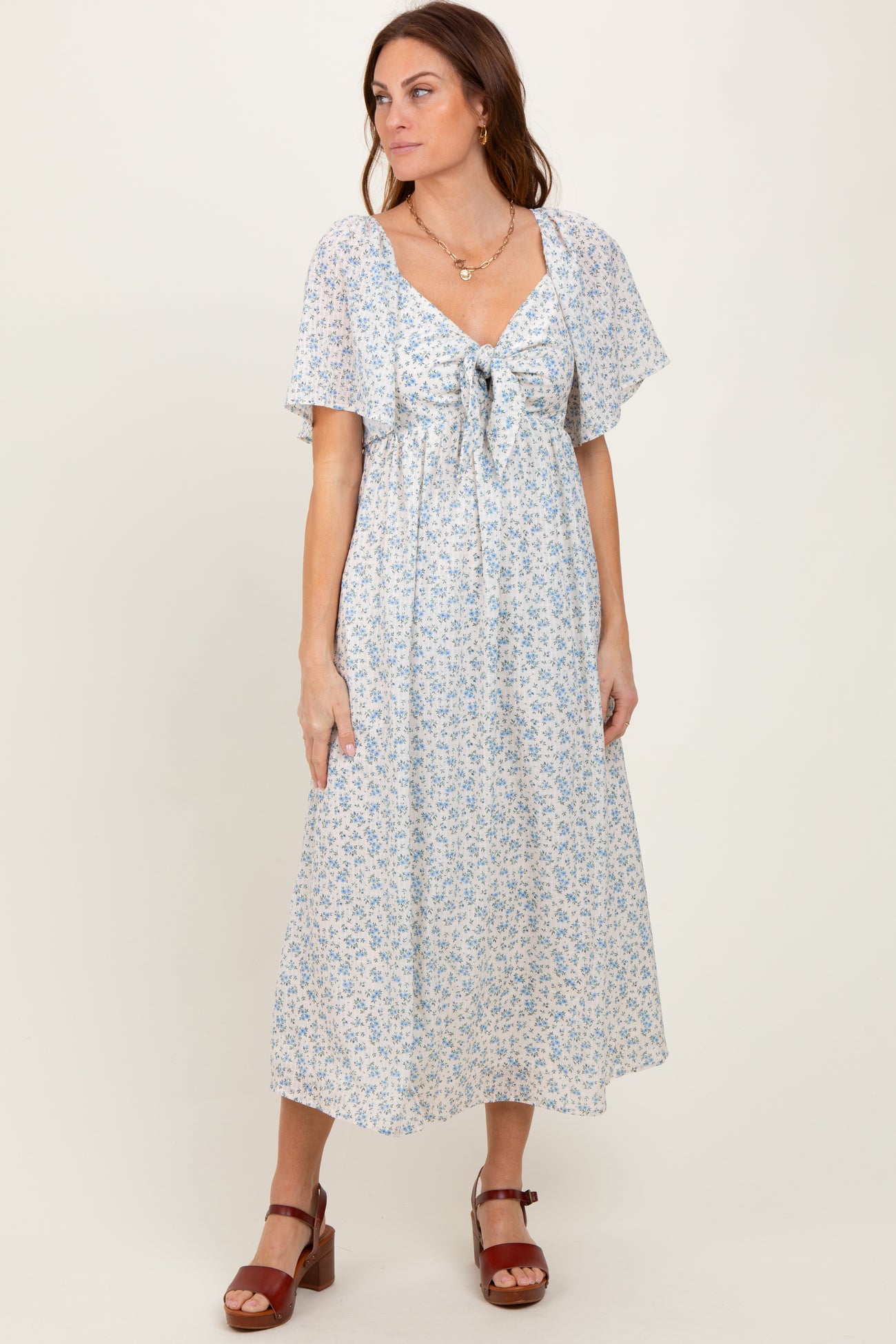 Blue Floral Front Tie Maternity Midi Dress