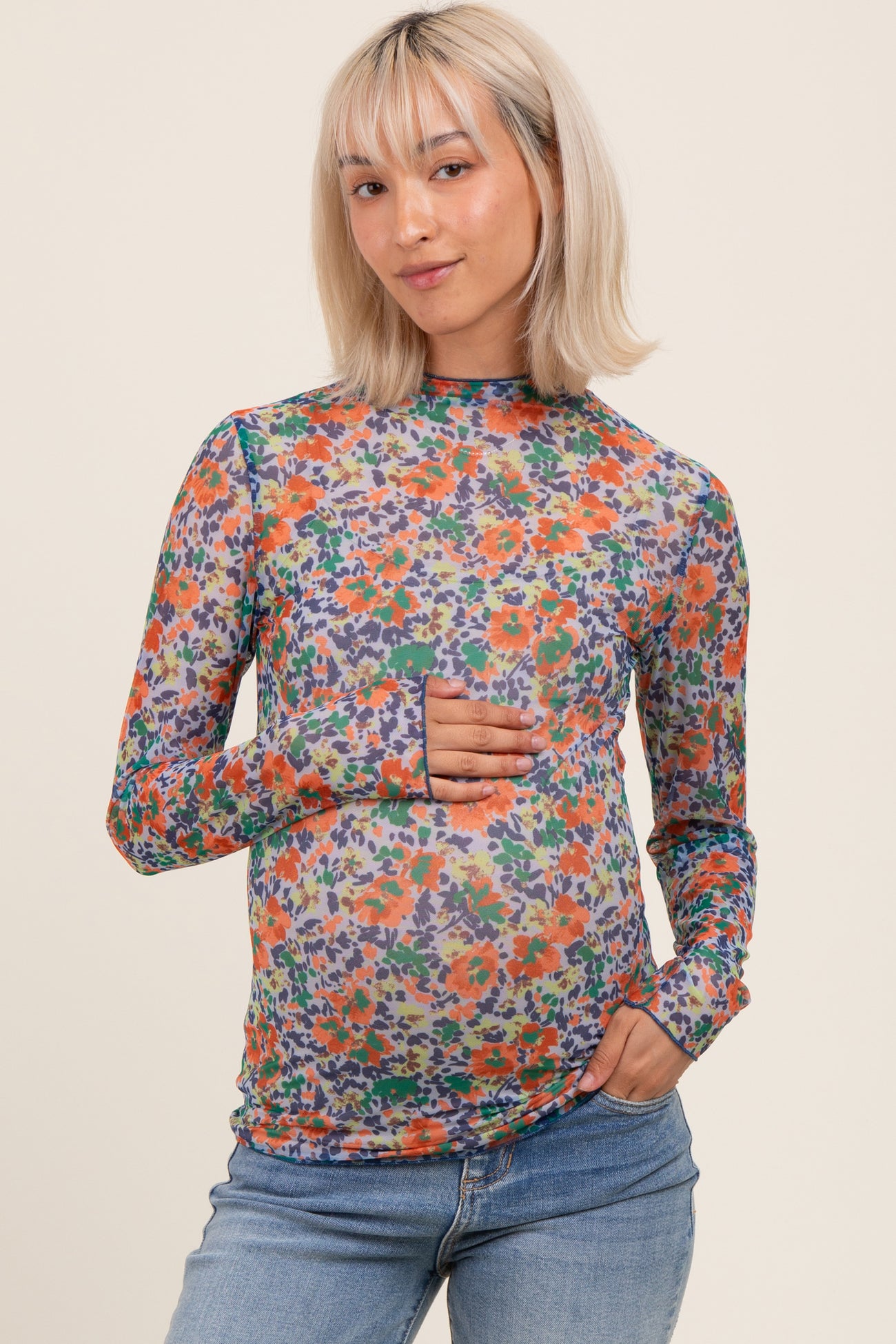 Elevate your maternity wardrobe with our Blue Floral Mesh Long Sleeve Turtle Neck Maternity Top. Featuring a delicate, sheer mesh fabric adorned with vibrant orange, green, and purple floral patterns, this top combines comfort and style effortlessly. The stretchy material gently hugs your growing bump, offering a flattering fit throughout pregnancy. With its cozy turtle neck and long sleeves, it’s perfect for layering or wearing alone in cooler weather. Embrace a trendy, feminine look while staying comfortable—pair it with jeans or your favorite maternity skirt for any occasion. Designed to celebrate your motherhood journey beautifully.