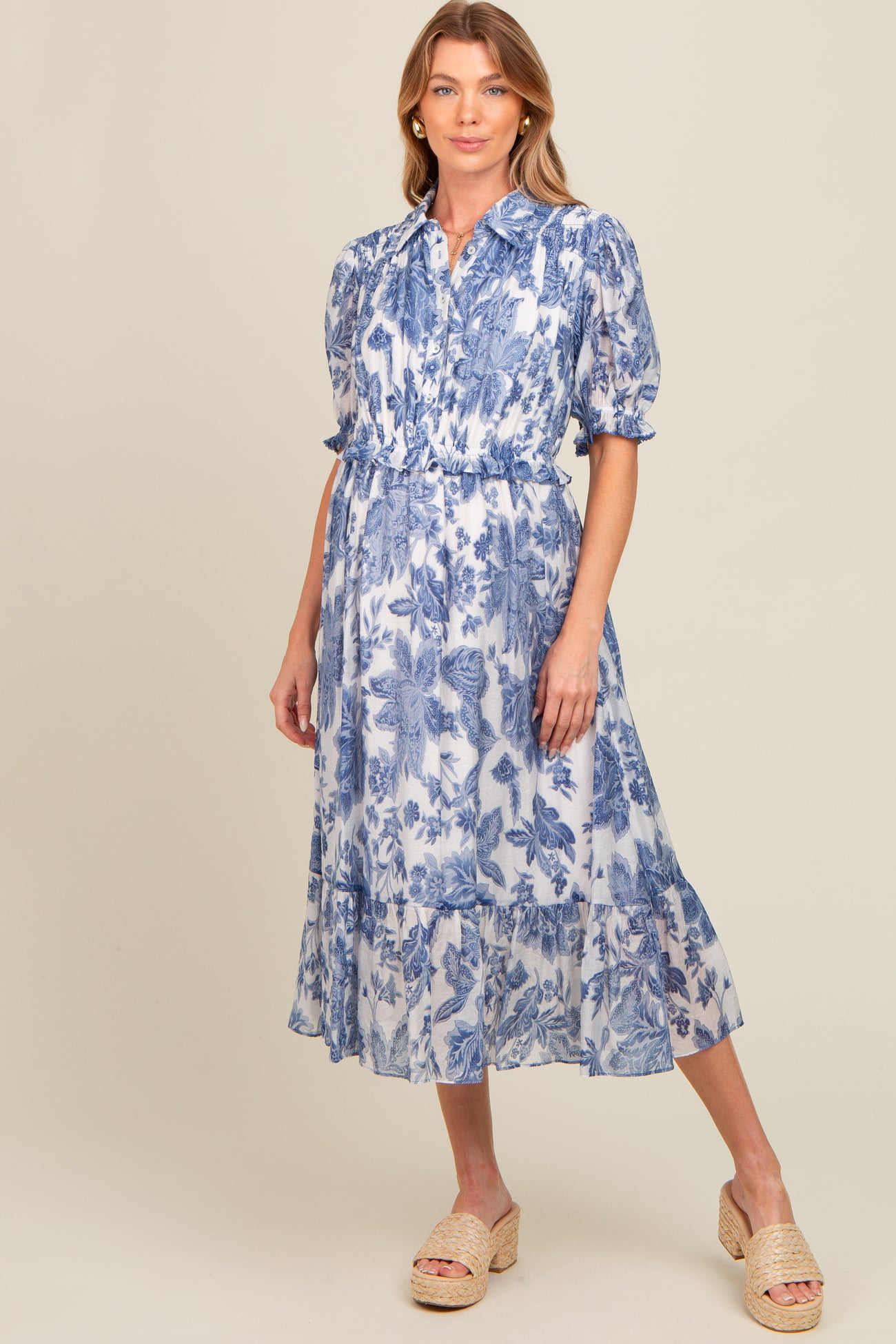 Blue Floral Ruffle Accent Button Up Maternity Midi Dress