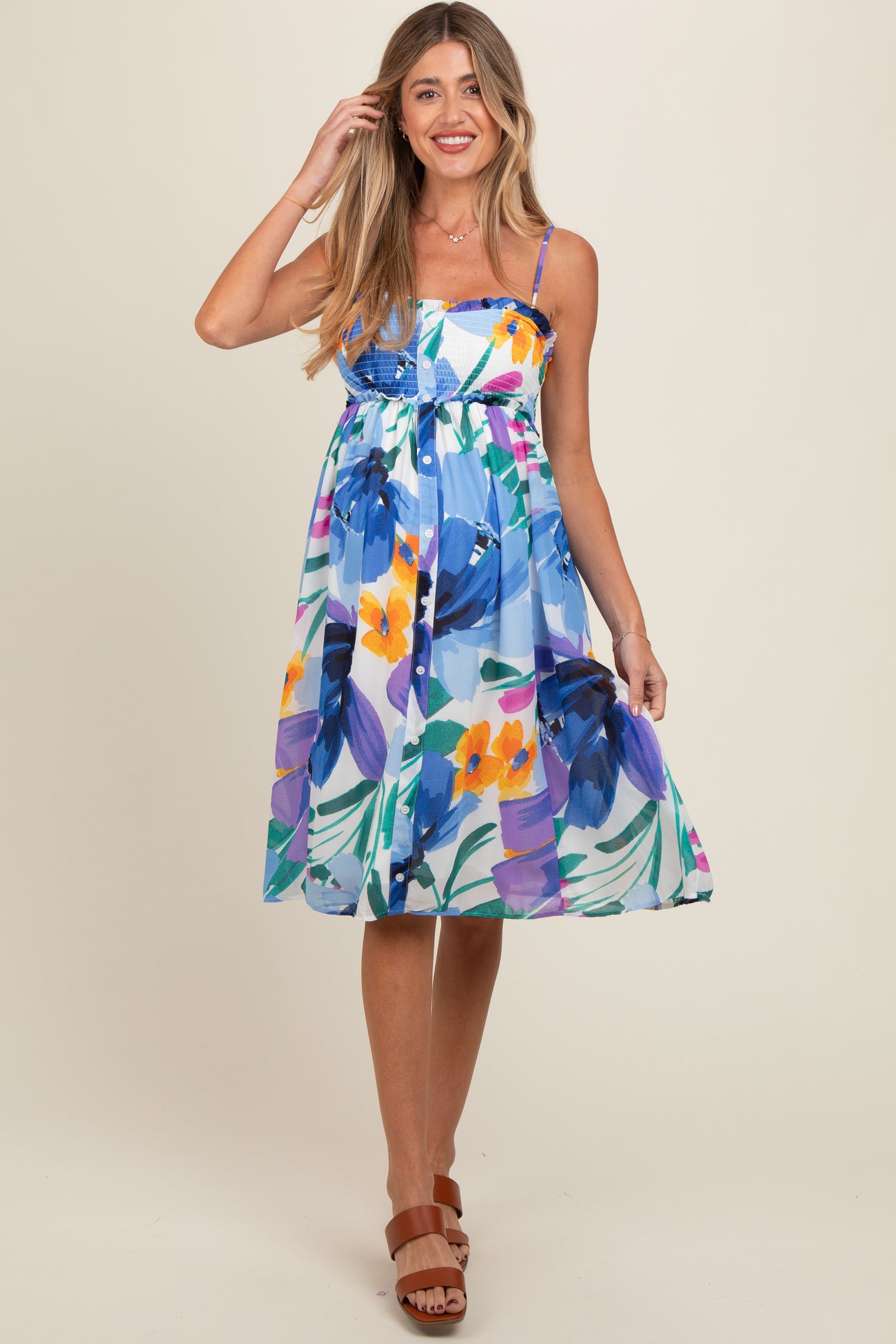 Blue Floral Smocked Chiffon Maternity Midi Dress