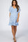 A floral printed dress with a v-neckline, smocked elastic bust, and ruffle accents.