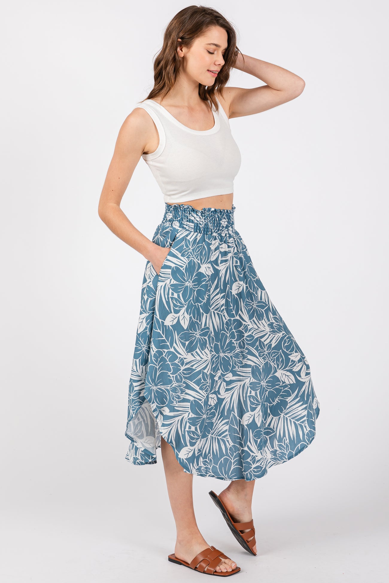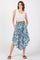 Blue Floral Smocked Waist Round Hem Midi Skirt