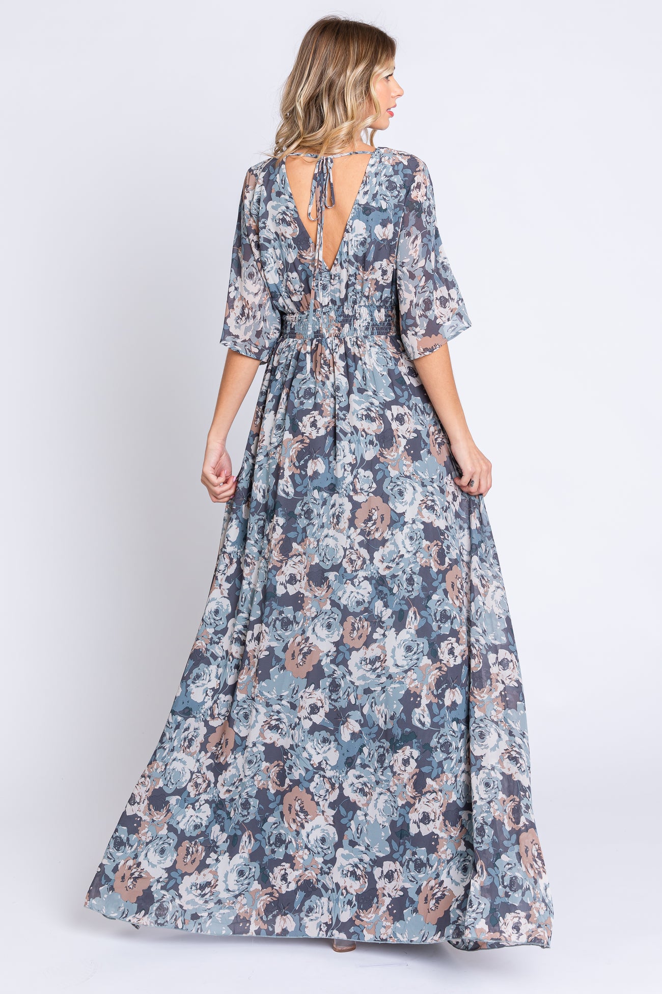 Blue Floral Wrap Front V-Neck Smocked Waist Maxi Dress