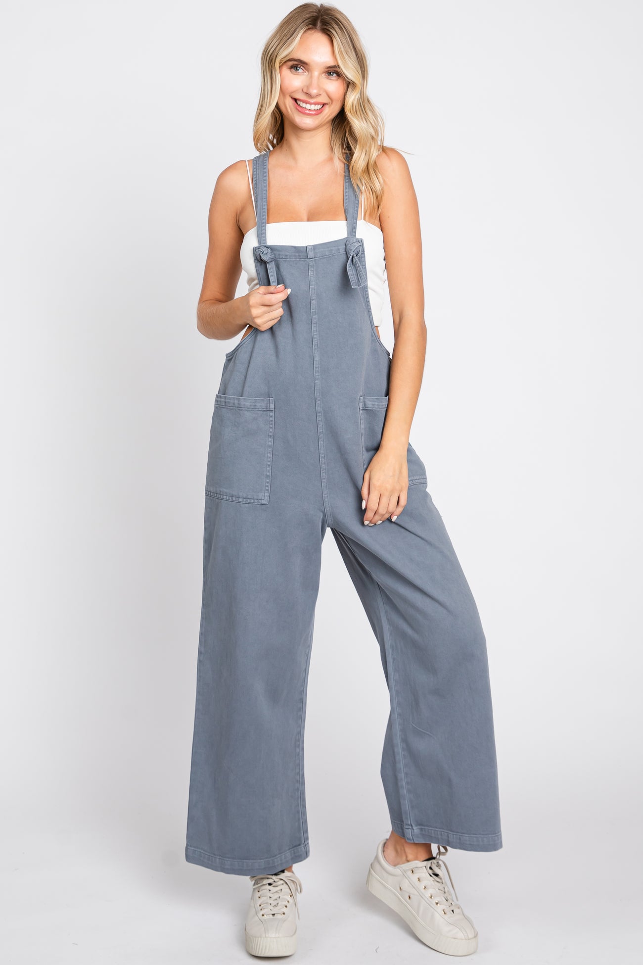 A solid hue overall featuring a squared neckline, knot tied straps, two front pockets, and cropped legs.