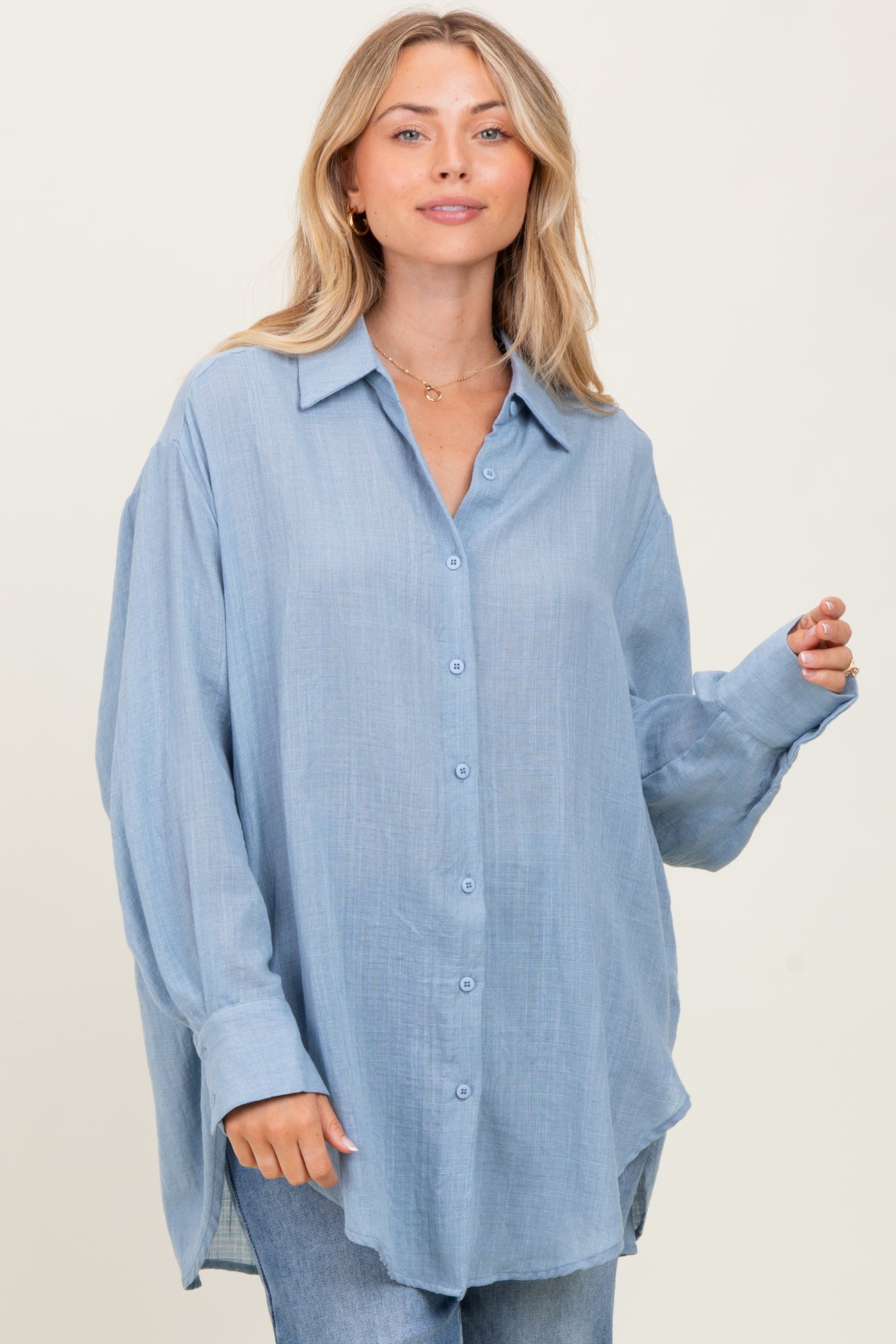 Blue Long Sleeve Collared Button Down Maternity Shirt