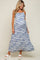 A printed maternity maxi dress featuring a straight neckline, a smocked back, a tiered body, and a back cutout. The front tie adjusts the straps.