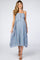 A multicolored striped maternity midi dress. Features button front detail and ruffle neckline. Includes thin adjustable straps, smocked back, two side pockets and a lined skirt.