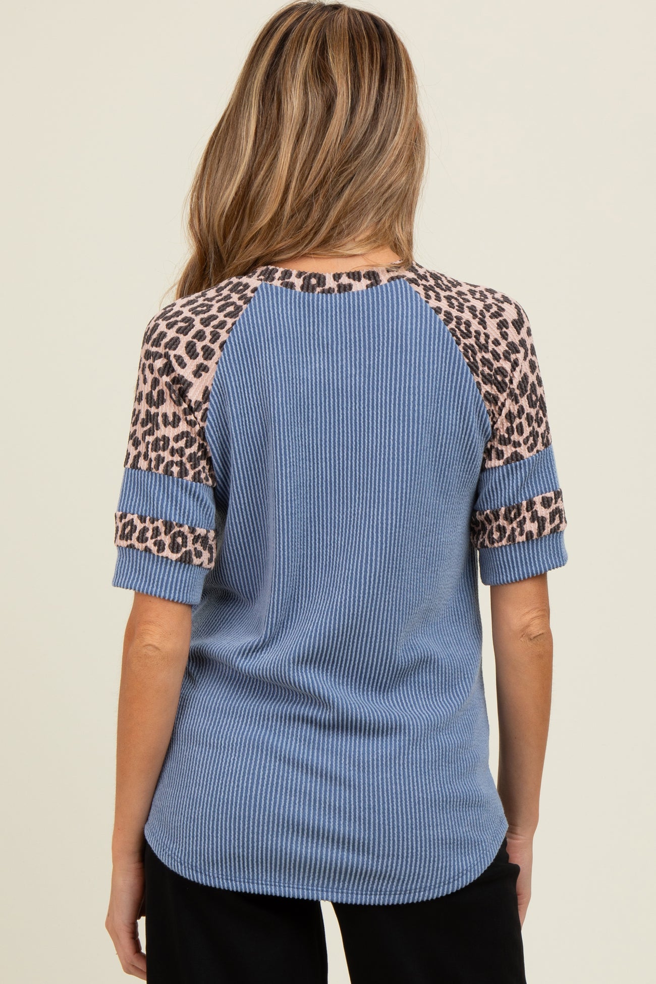 Embrace comfort and style with our Blue Ribbed Animal Print Contrast Short Sleeve Maternity Top. Crafted from soft, breathable ribbed fabric, this top gently stretches to accommodate your growing bump. The eye-catching leopard print accents on the sleeves and neckline add a trendy contrast to the serene blue base, creating a chic and modern look. Perfect for casual outings or relaxed days at home, its short sleeves and relaxed fit provide all-day ease. Pair it with your favorite maternity jeans or leggings for effortless maternity wear that’s both fashionable and functional.